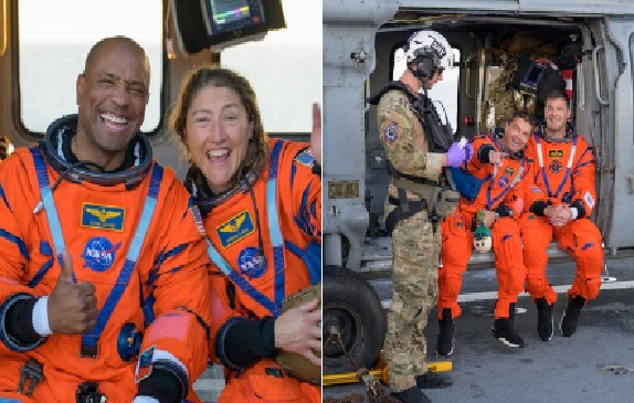 Helicópteros militares izaron a los astronautas uno por uno desde una balsa inflable acoplada a la cápsula, llevándolos a bordo para el corto trayecto hasta el buque de recuperación de la Armada que los esperaba, el USS John P. Murtha.