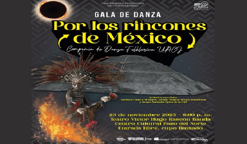 La Universidad Autónoma de Ciudad Juárez (UACJ), dio a conocer que mañana 23 de noviembre, la Compañía de Danza Folklórica de la máxima casa de estudios realizará un recorrido lleno de color, ritmo y tradición a través de las zonas más representativas de nuestro país, a través de una Gala de danza; por los rincones de México.