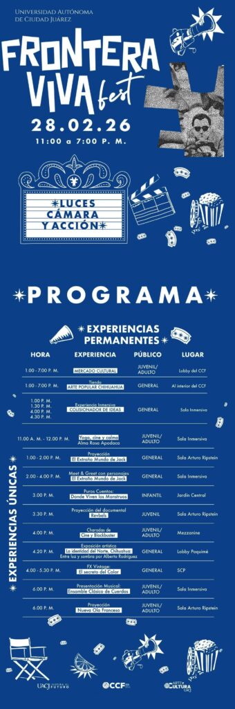La Universidad Autónoma de Ciudad Juárez (UACJ), informó que será este próximo sábado 28 de febrero de 2026 cuando se lleve a cabo el Frontera Viva Fest en el Centro Cultural de las Fronteras.