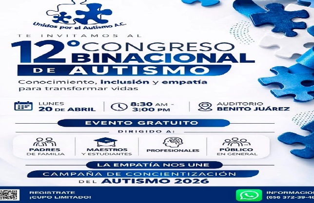 Con el objetivo de fortalecer la inclusión y generar conciencia social, el próximo 20 de abril se realizará el XII Congreso Binacional de Autismo en el Auditorio Cívico Municipal Lic. Benito Juárez.