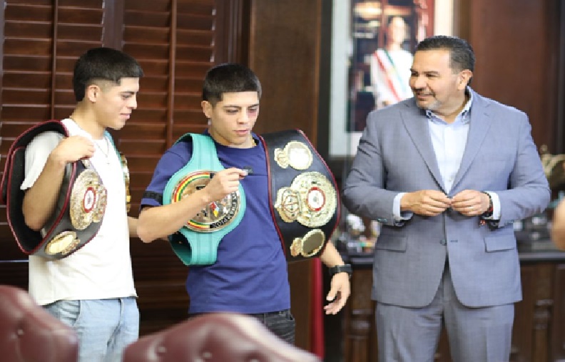 Los hermanos y campeones del boxeo, Ari y Andrey Bonilla, visitaron este mediodía al Presidente Municipal, Cruz Pérez Cuéllar, con el fin de agradecer el apoyo que el edil les ha brindado y para hacerle conocer los resultados de sus recientes encuentros.