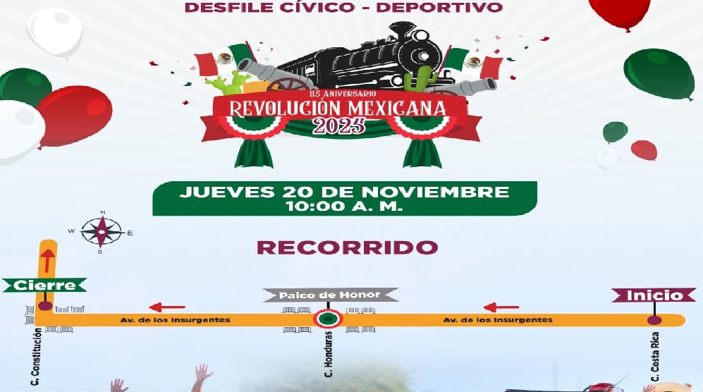 Detalló que el desfile dará inicio a las 10:00 de la mañana en la calle Costa Rica y avanzará sobre la avenida De los Insurgentes hasta llegar a la Constitución, donde concluirá el recorrido, mientras que el palco de honor, se colocará en el cruce De los Insurgentes y Honduras.