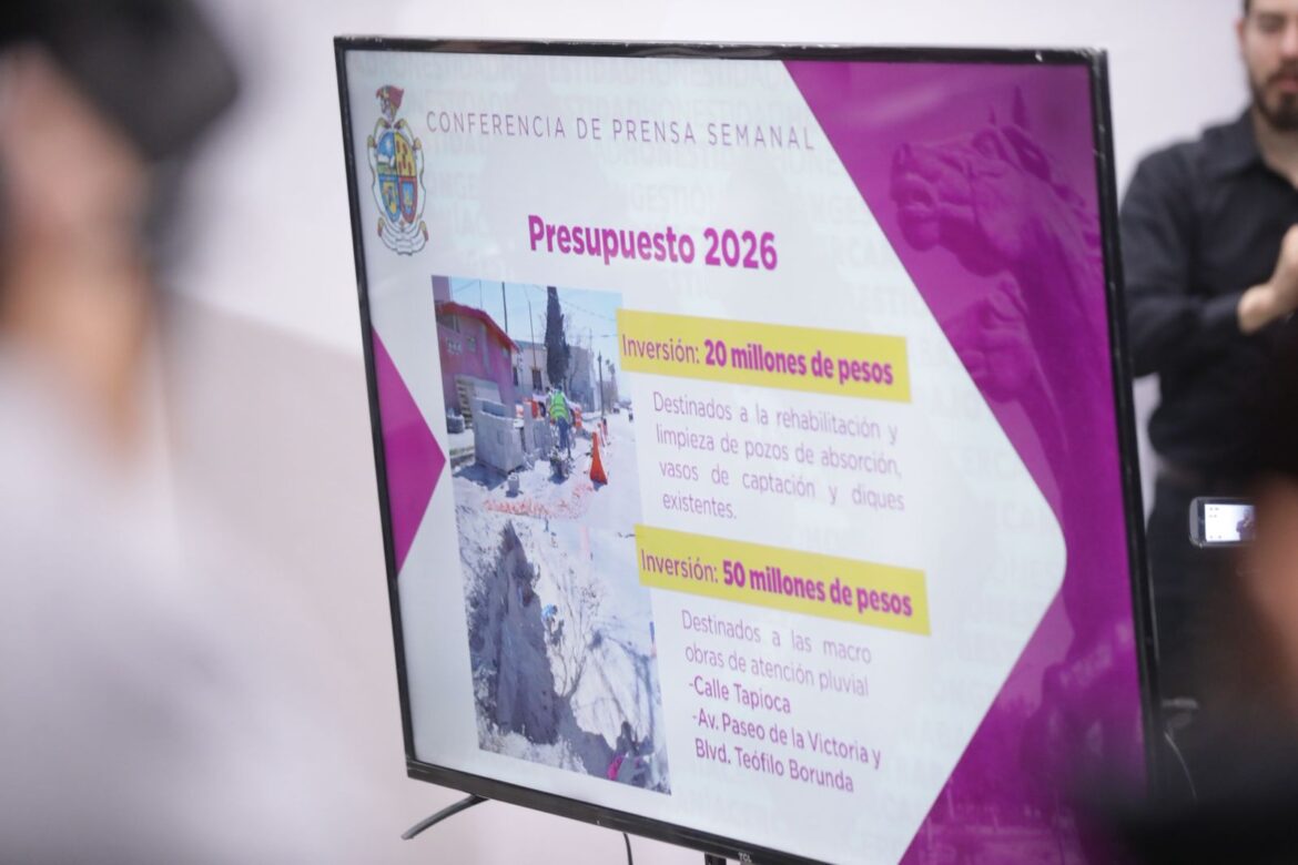 González García informó además que el presupuesto 2026 incluirá 20 millones de pesos para la rehabilitación y limpieza de pozos de absorción y vasos de captación construidos durante la actual administración. A esto se suman 50 millones de pesos destinados a macro obras pluviales en la calle Tapioca y en el cruce del bulevar Teófilo Borunda con Paseo de la Victoria.