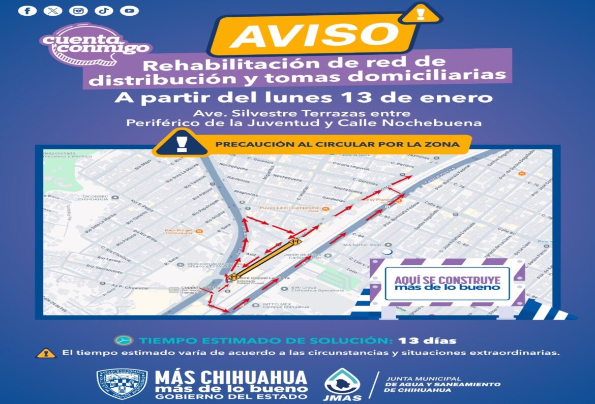 La Junta Municipal de Agua y Saneamiento (JMAS) iniciará a partir de este lunes, los trabajos de rehabilitación de la red de distribución y tomas domiciliarias, en avenida Silvestre Terrazas, entre periférico de la Juventud y calle Nochebuena.