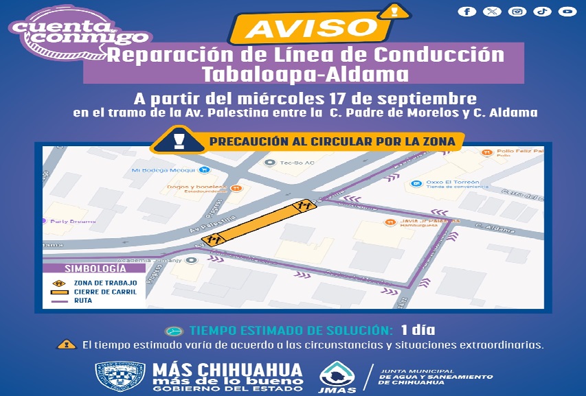 La Junta Municipal de Agua y Saneamiento (JMAS) de Chihuahua, informó que el día de mañana realizarán trabajos de reparación en la conducción de agua potable Tabalaopa-Aldama.