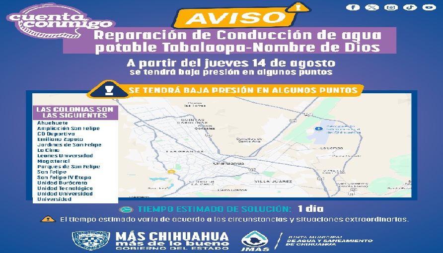 Este jueves 14 de agosto, personal técnico de la Junta Municipal de Agua y Saneamiento (JMAS) de Chihuahua trabajará en la reparación de una fuga detectada en el conducto de agua potable Tabalaopa-Nombre de Dios.