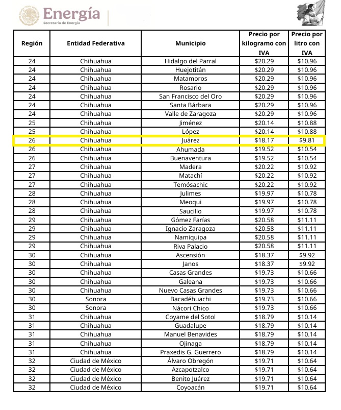 La misma CRE informó que para la ciudad de Chihuahua capital, el costo del combustible presentará una situación similar que en Ciudad Juárez, puesto el precio para la misma semana será de 10.85 pesos por cada litro y 20.10 por cada kilo.