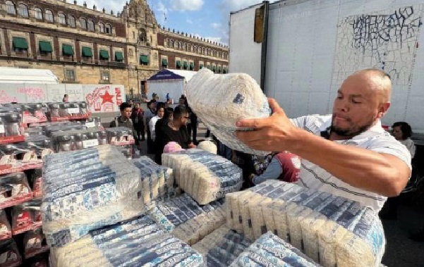 Desde las 11 de la mañana, el Zócalo de la Ciudad de México —casi en la esquina de Corregidora y Plaza de la Constitución— se convirtió en un punto de encuentro para jóvenes, familias, jubilados, trabajadores y maestros que llegaron con bolsas y cajas repletas de arroz, frijol, leche en polvo, sardinas y medicamentos.