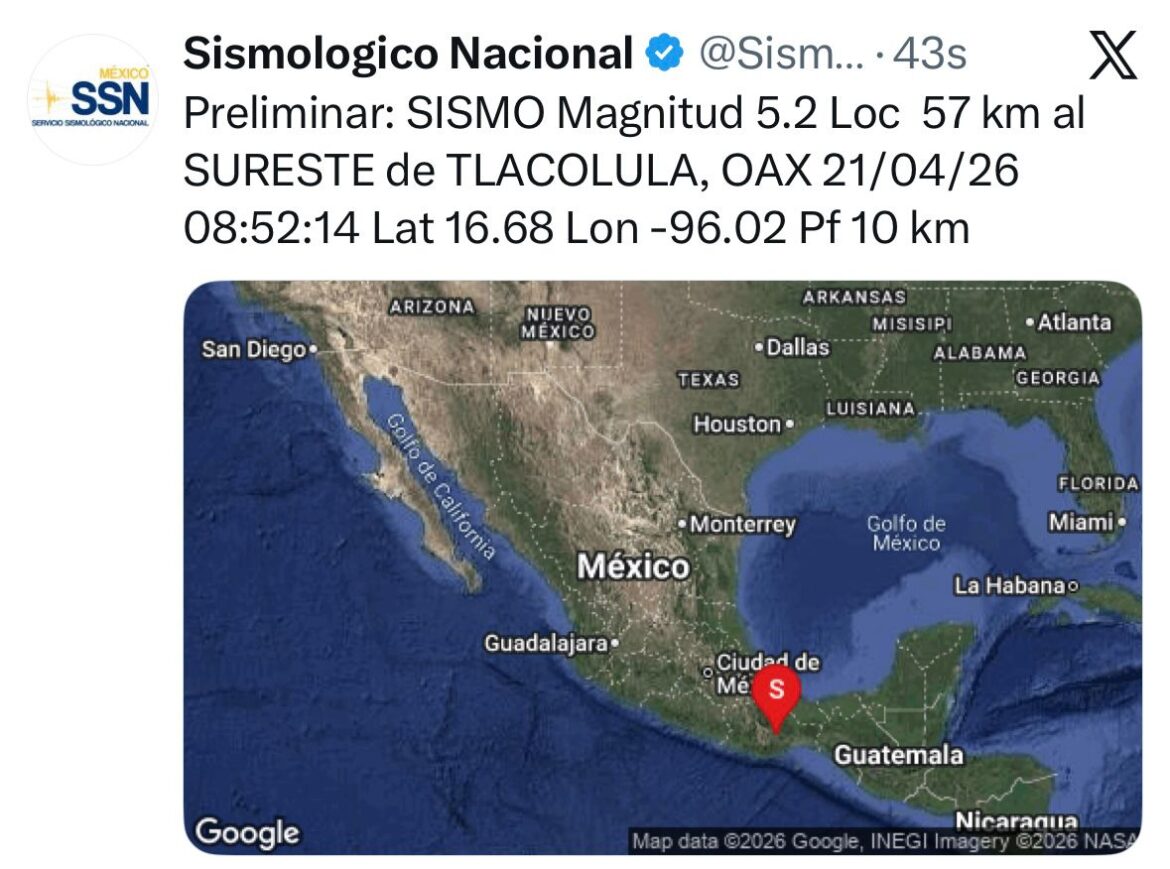 Un sismo de magnitud preliminar 5.2 se registró la mañana de este martes 21 de abril en el estado de Oaxaca, con epicentro localizado en las inmediaciones de Tlacolula, según información del Servicio Sismológico Nacional.