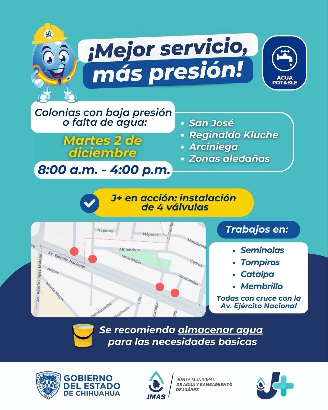 Por estas acciones, habrá suspensión del servicio en las colonias: San José, Reginaldo Kluche, Arciniega y zonas aledañas.