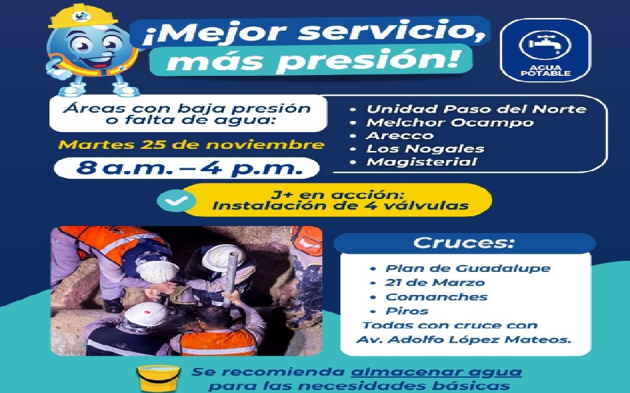 Por estas acciones, habrá suspensión del servicio en los fraccionamientos: Unidad Paso del Norte, Melchor Ocampo, Arecco, Los Nogales, Magisterial y zonas aledañas.