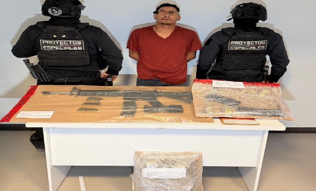 Al momento de su detención, le encontraron un arma larga de color negro con un cargador de plástico, abastecido con 28 cartuchos útiles, un teléfono celular en color rosa, un chaleco táctico pincelado color verde y dos cargadores de plástico color negro, con 18 cartuchos útiles cada uno.
